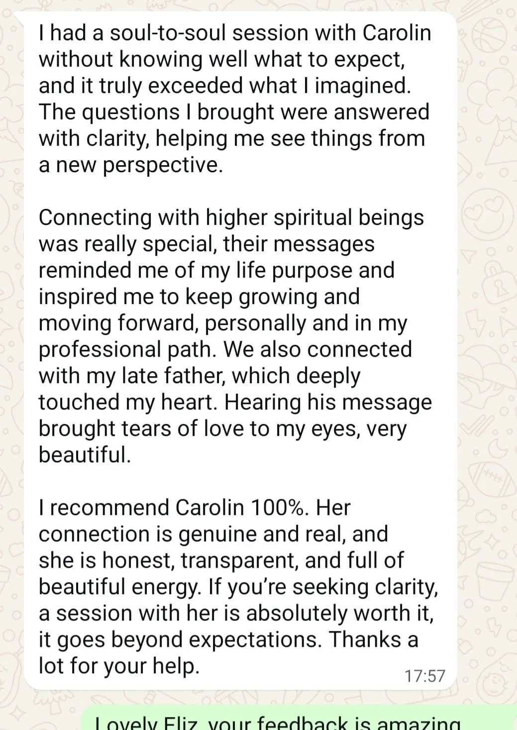 Carolin is such a warm and gentle soul with a truly loving energy. During the reading, I immediately felt at ease and surrounded by kindness. She has a beautiful gift for tuning into the energy around you and sharing messages with deep empathy and sincerity. It was a heartfelt experience that left me feeling peaceful and connected.